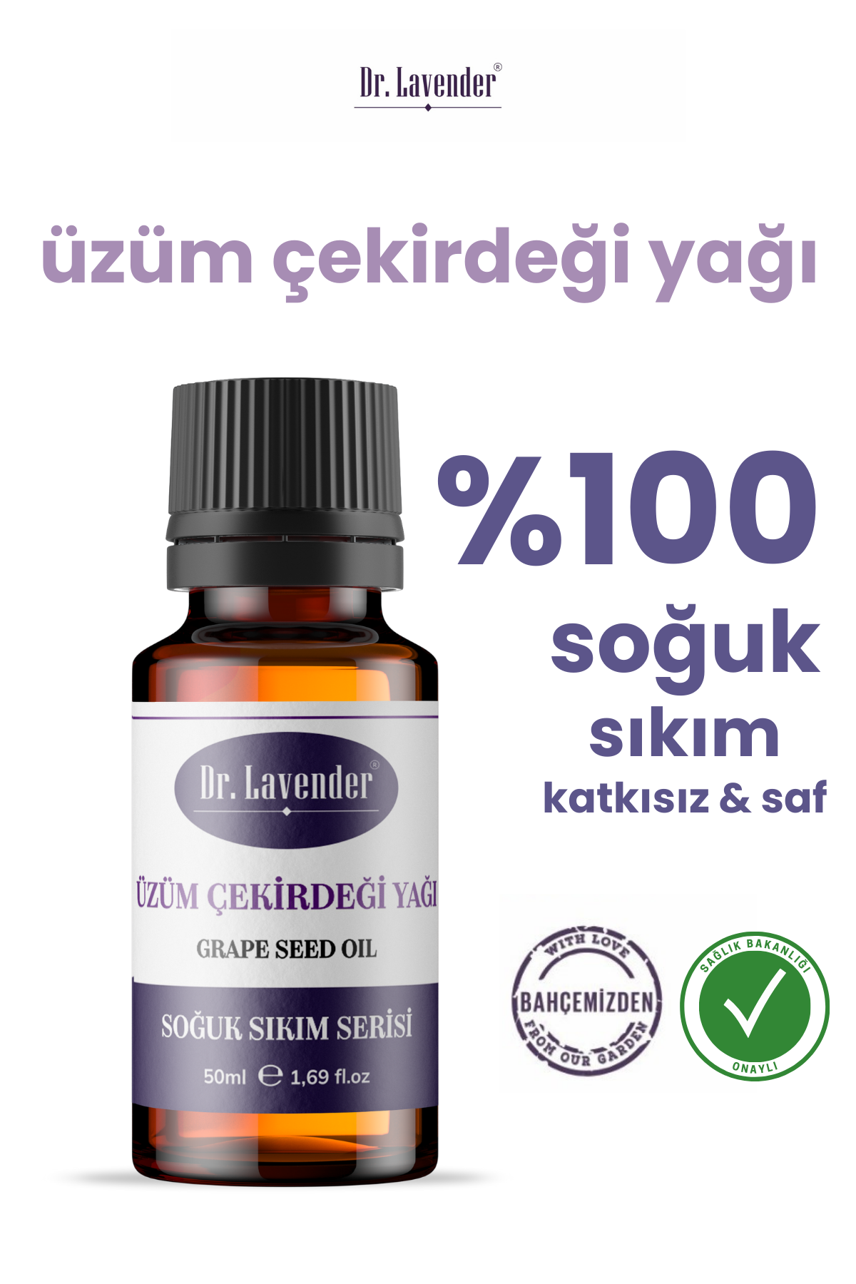 Dr. Lavender Üzüm Çekirdeği Yağı (Grape Seed Oil), üzüm çekirdeklerinin ısıl işlem görmeden, soğuk sıkım yöntemiyle preslenmesiyle elde edilen hafif yapılı ve kokusuz bir bakım yağıdır. Diğer yağlara göre çok daha ince bir yapıya sahip olduğu için cilt tarafından hızla emilir ve yağlı bir his bırakmaz. Tüm cilt tipleri için uygun olmakla birlikte, özellikle yağlanmaya meyilli ciltler için ideal bir nemlendiricidir.